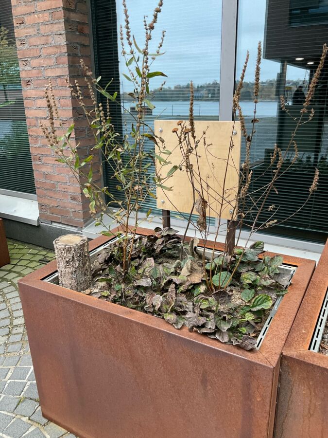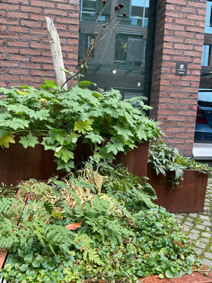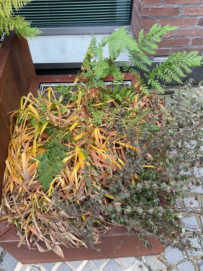 Syksyiset kasvit tarjoavat maisemaan kauniit väriskaalat, kun lehtivihreä kulkeutuu maanalaisiin osiin ja lehden muut värit pääsevät esille. Keväällä kukkivat kasvit kuten esikot ja kielot ovat kuihtuneet näkymättömiin jo keskikesällä. Jotkin kasvit, kuten verikurjenpolvet nurkan istutuksessa, käyttävät hyväkseen syksyn viimeisimmätkin valonsäteet ja ovat rehevimmillään, kun pakkaset tulevat ja palelluttavat kaiken.
