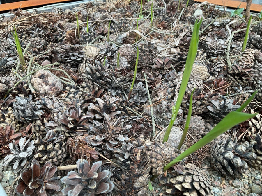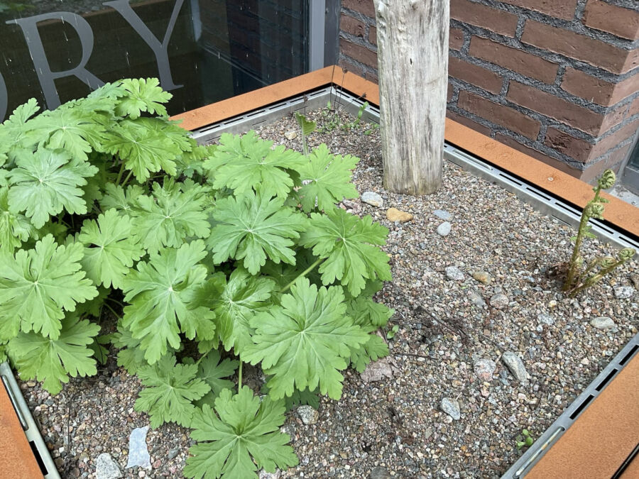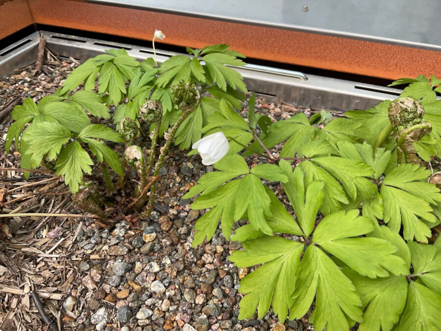 Osa kasveista on lähtenyt nopeasti kasvuun kylmistä ilmoista huolimatta. Kurjenpolvet ovat jo rehevässä kasvussa, kun muut vasta alkavat nousta pintaan.