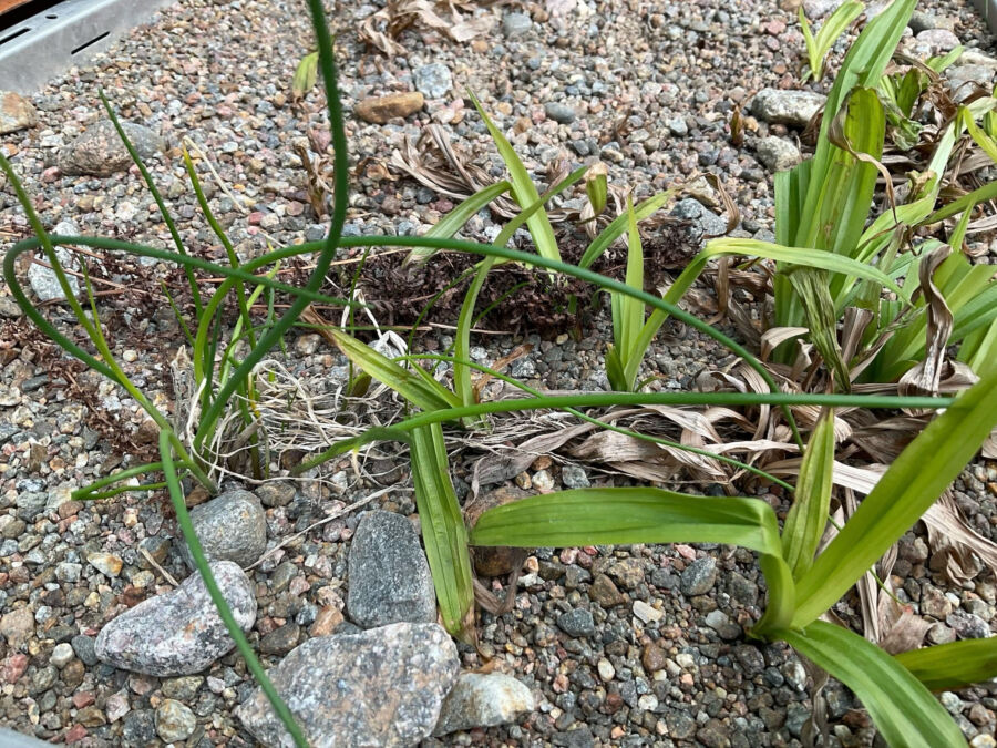 Iso osa kasveista on vielä ensimmäisenä keväänään, uudessa kasvupaikassa hyvin vaatimattomia. Ne kasvattavat ensin vahvan juuriston, jonka turvin ne voimistuvat ja pystyvät rehevöitymään. Tässä laatikossa on muun muassa ruohosipulia joka on myös kaunis kukka sekä hyvä kasvi pölyttäjille. Leveälehtinen kasvi on idänvarjosara.