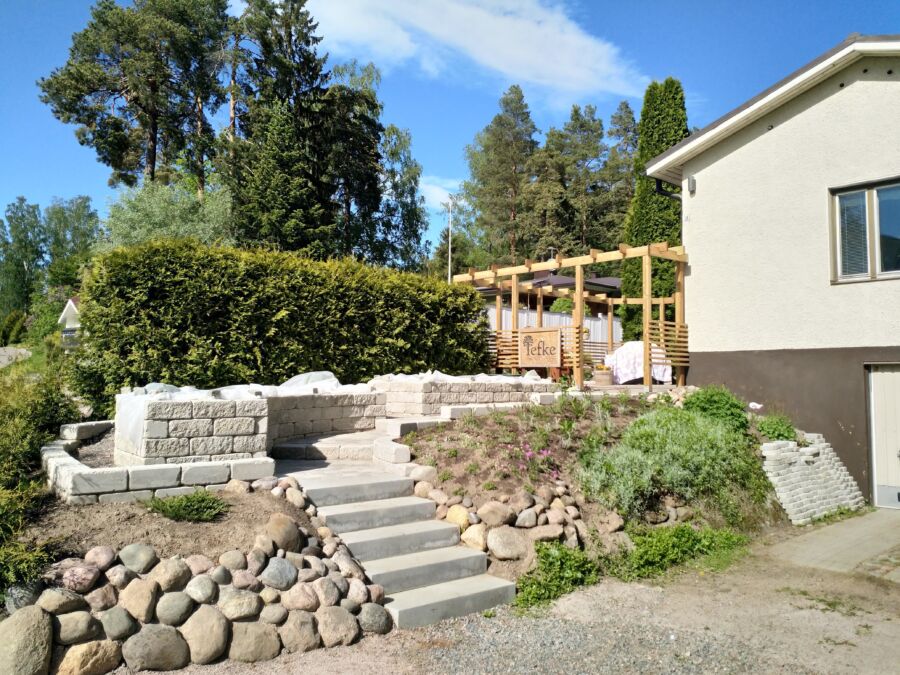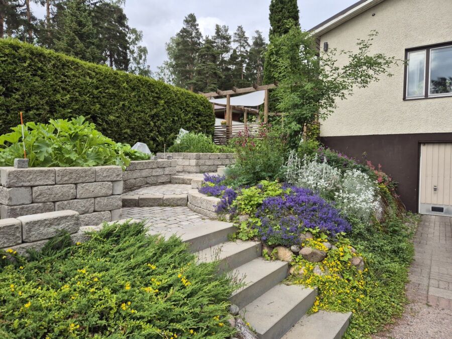 Tällä helsinkiläispihalla muutimme etupihan vaikeahoitoisen nurmirinnealueen toimivaksi, eläväksi hyötytarhaksi. Alue pengerrettiin, betonikivistä rakennettiin selkeä portaikko sekä rajatut istutusalueet. Näin, permakulttuurin periaatteiden mukaisesti, hoitoa vaativat viljelykasvit tuotiin kulkureittien sekä asuinrakennuksen läheisyyteen. Ratkaisu muutti aiemmin käyttämättömän piha-alueen kauniiksi, monimuotoiseksi ja kiinnostavaksi hyötytarhaksi.