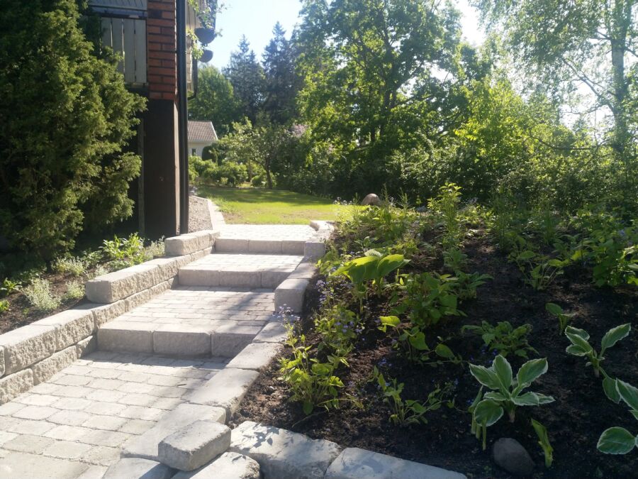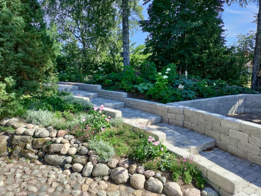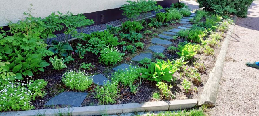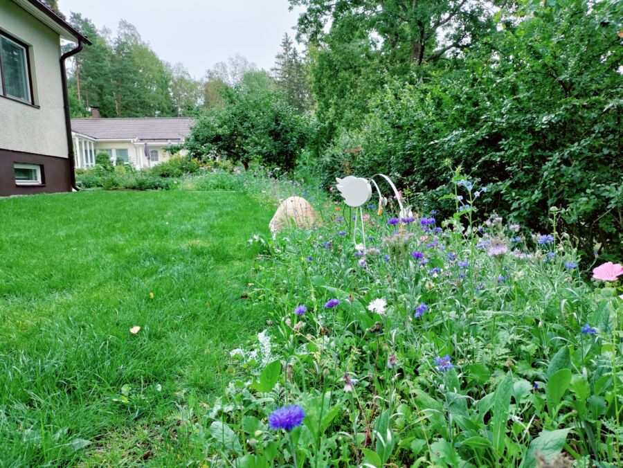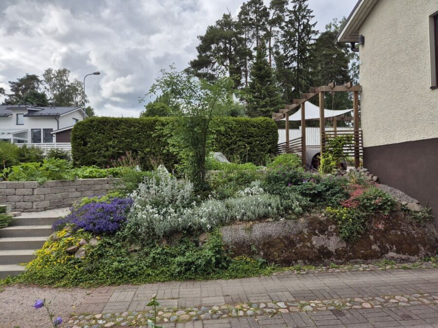 Istutusalueilla hyödynnettiin talteen otettua vanhaa kasvualustaa, mikä tukee maaperän pieneliötoimintaa ja istutusten elinvoimaa. Takapihan puolella uudet ja olemassa olevat kasvit yhdistettiin dynaamisiksi, monilajisiksi istutusalueiksi ja nurmialueen reunat rajattiin niityksi. Näin luotiin pihaan sekä helppohoitoisuutta että monimuotoisuutta tukevat rakenteet sekä viihtyisiä, kutsuvia alueita pihan käyttäjille.